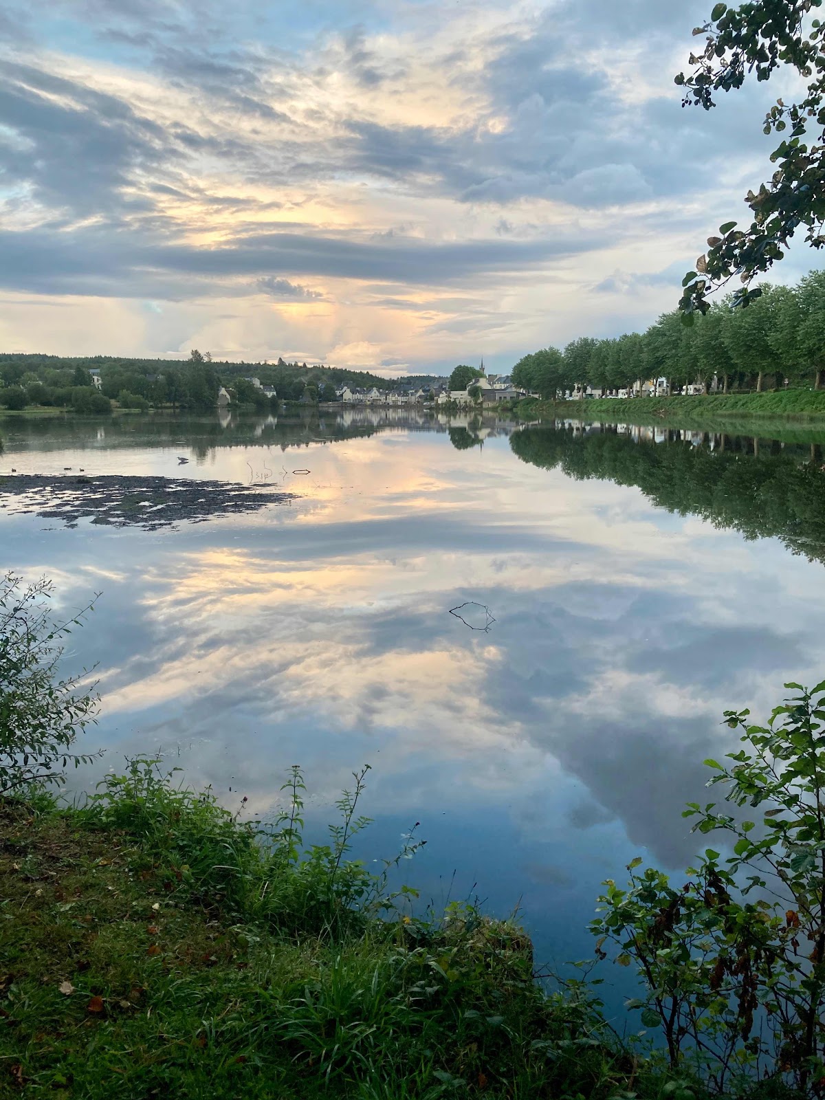 We’d decided to camp at a place called Huelgoat, which, it turns out is twinned with St Just in Cornwall! It’s a 3km detour from the track, but looked worth the extra effort. Although 3km isn’t far, it seems it when you’ve already ridden over 65km and off the cycle route, we suddenly had a few hill climbs to contend with. We arrived at the lake side village feeling pretty exhausted. Pulled over at the lakeside hotel terrace and immediately ordered Tarte du Pomme and coffee, which helped a bit.