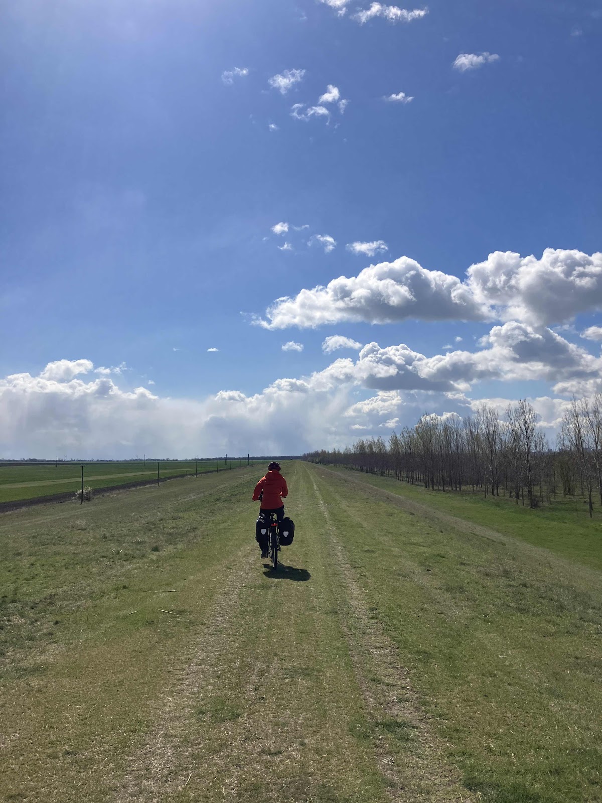 In the end we decided to do a longer (but much safer) route, rather than risk the road, or the difficult riding in the grassy dyke. It turned out to be much longer than anticipated, but did afford us a nice place to rest for some food.